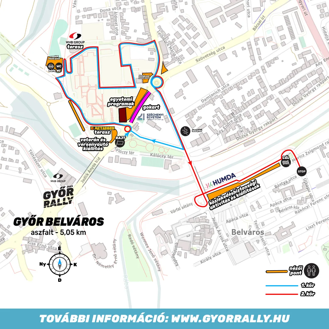 Szombaton és vasárnap a versenyzők különböző gyorsasági szakaszokat teljesítenek, a második nap folyamán Győr belvárosában is. Az 5,05 km-es szakasz kétszer érinti a Széchenyi István Egyetem campusát, az Egyetem főbejáratához közel kialakított Metabond teraszt, valamint a Mobilis tetején lévő WHB teraszt, áthalad a Kossuth hídon és a Dunakapu téren túl végződik.