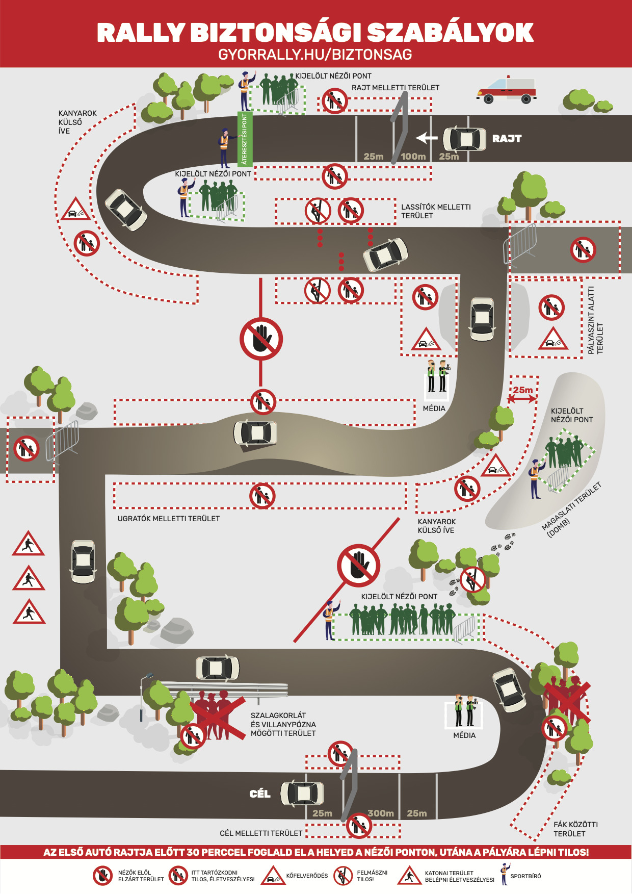 Motorsport can be dangerous – that’s why we need your help. Riders may have technical problems or other reasons that prevent them from keeping their car on the road. This makes it vitally important that you, as a fan, know where you stand. The graphics below show the dangerous places where you are not allowed to be. Please keep this in mind and your rally experience will not only be exciting, but safe!